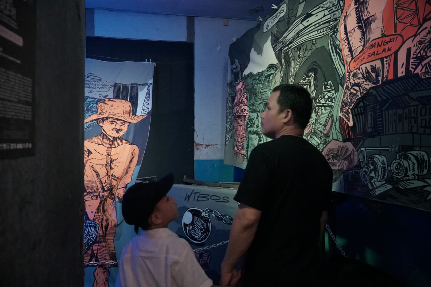 Pameran ini tidak sebatas apresiasi seni belaka, tapi juga punya tujuan edukasi. Mahatma Muhammad, kurator Kaba Rupa, yang saya temui di lokasi, menyebutkan hasil riset diolah dan dijelma menjadi pelbagai karya seni seperti instalasi patung, kolase, sketsa, lukisan, mural, foto arsip, soundscape, dan visual mapping tiga dimensi.